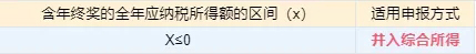 1、當年收入(含年終獎)減去6萬及三險一金、附加扣除等后應納稅所得額≤0