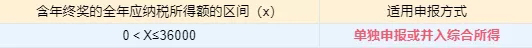 2、當年收入(含年終獎)減去6萬及三險一金、附加扣除等后應納稅所得額≤36000