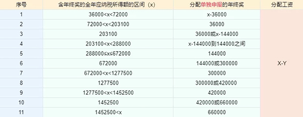 當含年終獎的全年應納稅所得額大于36000時,由于年終獎單獨申報存在雷區等原因,為使稅負最低,可在年終獎和工資之間進行分配,分配的年終獎按照全年一次性獎金單獨申報。